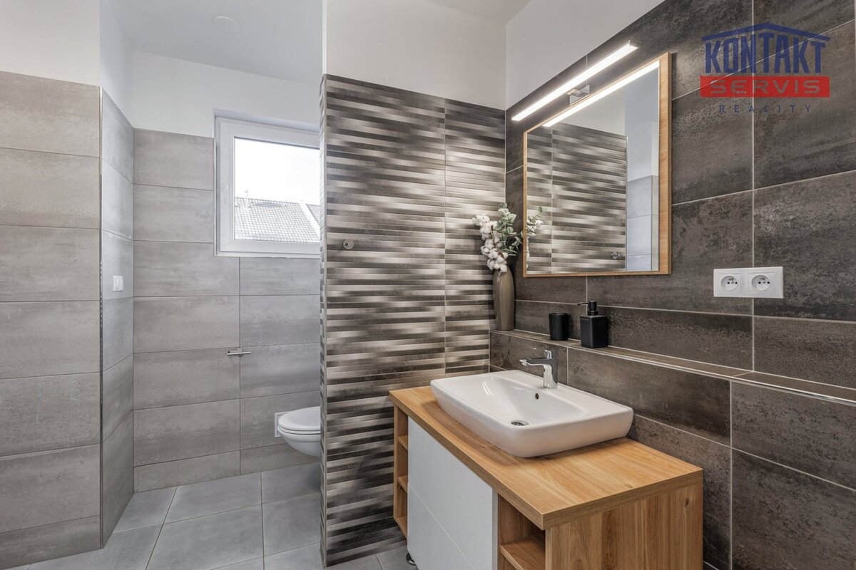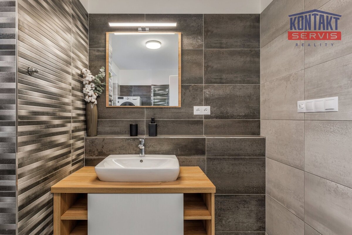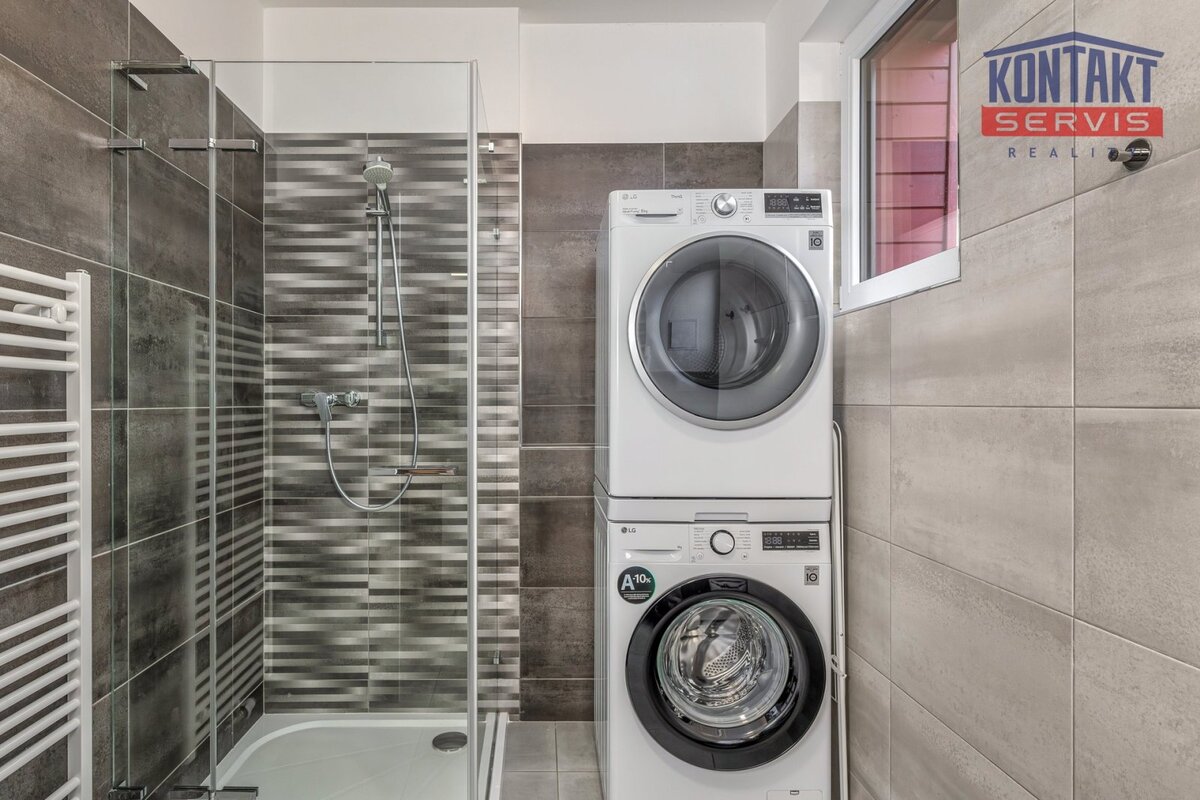 Koupelna je elegantně zařízená a vybavená sprchovým koutem Walk-in, umyvadlem se zrcadlem, toaletou a praktickou pračkou se sušičkou.