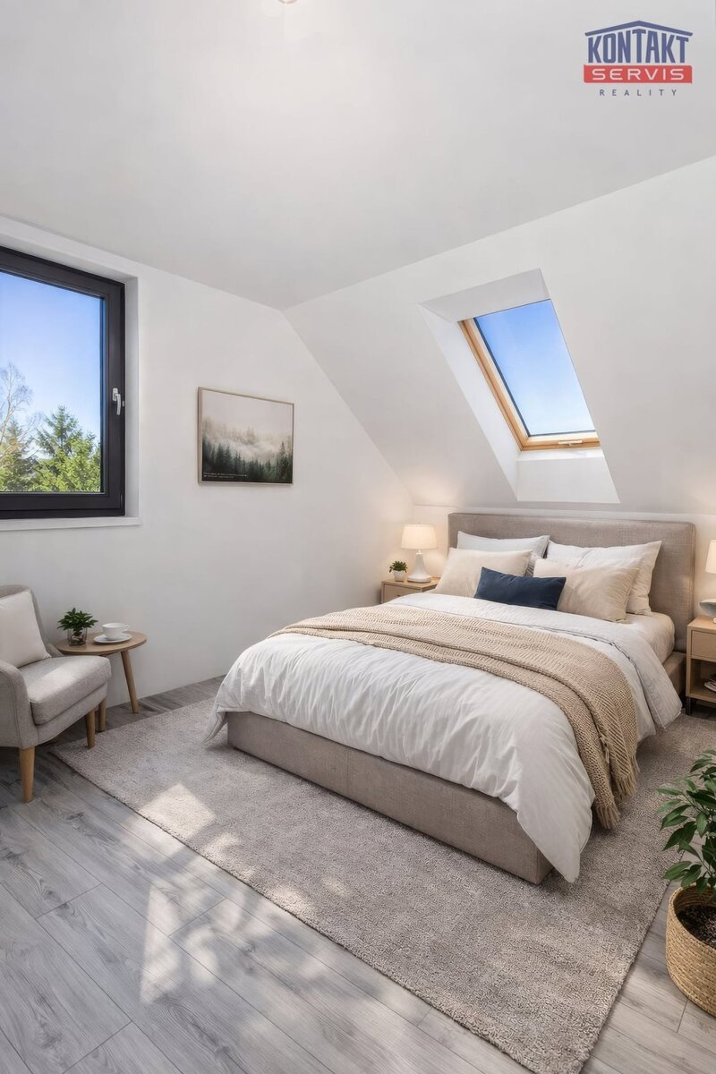 Celková užitná plocha domu dosahuje 115 m2 – z toho 61 m2 přízemí a 54 m2 vzdušného obytného podkroví. Díky geniálně řešené dispozici 5+kk zde najde svůj koutek každý člen rodiny a ještě vám zbyde prostor navíc!