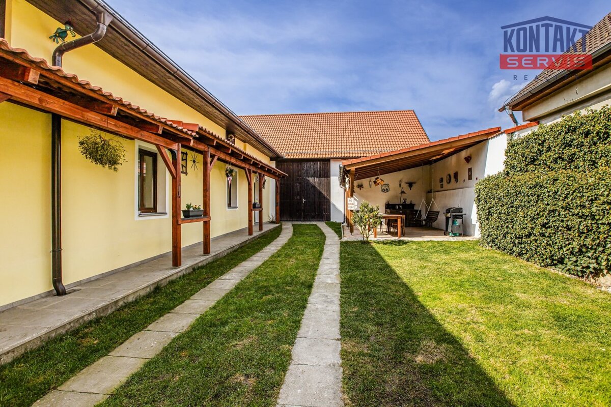 Nabízíme ke koupi kompletně rekonstruovanou vesnickou usedlost v obci Dunajovice, která se nachází necelých 6 km od lázeňského města Třeboň a 20 minut jízdy od jihočeské metropole. Hlavním obytným prostorem je samostatná jednotka o dispozici 5 + kk, přičemž v přízemí se nachází velký obývací pokoj spojený s kuchyní, samostatná ložnice a prostorná koupelna. V podkroví jsou pak tři pokoje a druhá koupelna se sprchovým koutem a toaletou. V hlavní budově na obytnou část navazují další prostory, které lze buď využít jako technické zázemí domu nebo je zde možno vybudovat další bytové jednotky (veškeré přípravy rozvodů jsou provedeny). V uzavřeném dvoře se nachází krásná pergola a samostatně stojící vejměnek s navazující kotelnou. Půdorys stavení uzavírá prostorná a průjezdná stodola. Za domem je k využití rozlehlá udržovaná zahrada s vedlejšími stavbami (krytá parkovací stání pro tři auta, kolna, přístřešek na dřevo apod.). Dům je napojen na obecní vodovod a kanalizaci, k dispozici je i vlastní studna. Zavedena je také elektřina 230/400 V. Vytápění je zajištěno vlastním kotlem na dřevoplyn s rozvodem do podlah nebo radiátorů. Celková výměra pozemků činí 1 633 m2. Tato výjimečná nabídka je vhodná pro ty, kteří touží po velkém historickém stavení v novém kabátě. Podrobnosti k zakázce a osobní prohlídku Vám rádi zprostředkujeme.