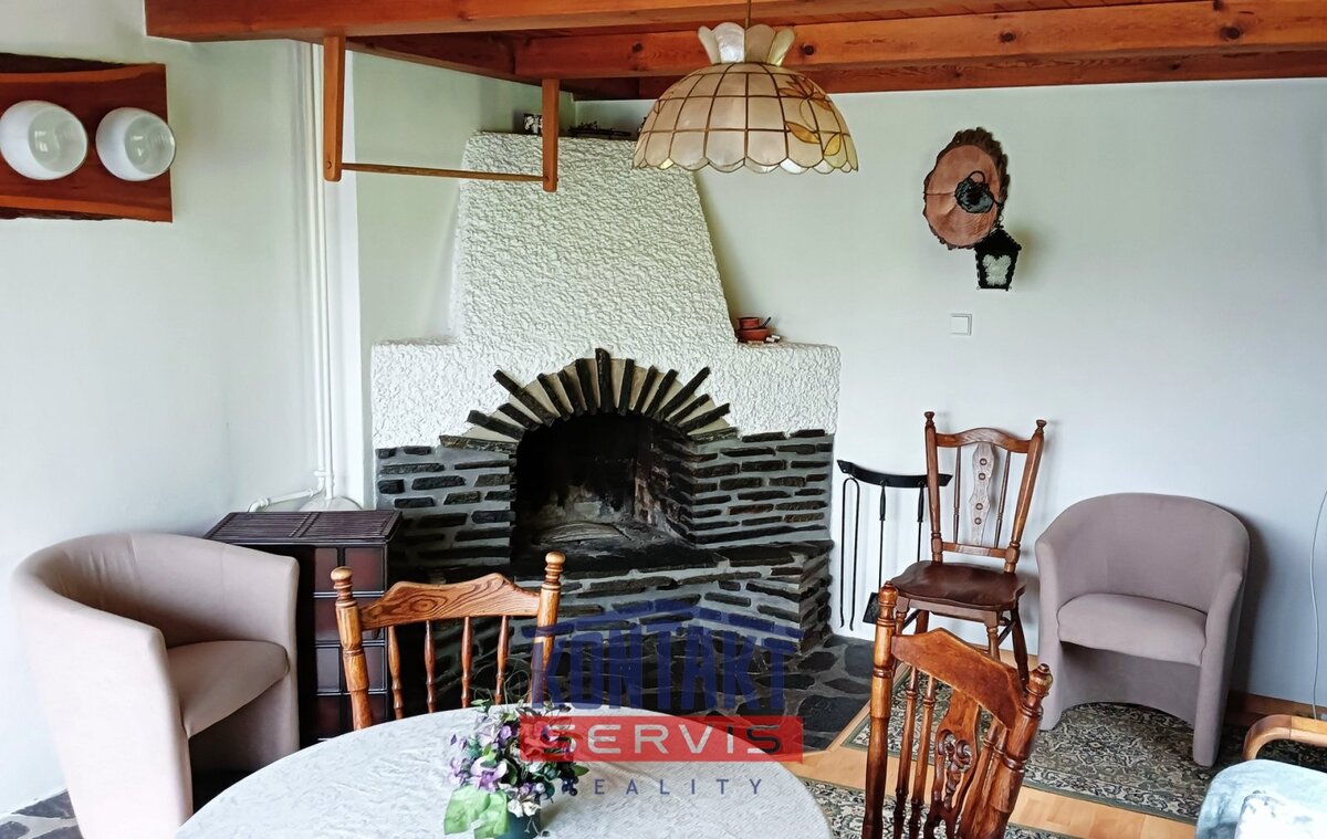 se nachází obývací prostor s krbem a kamny, kuchyň, koupelna s WC, pokoj,
